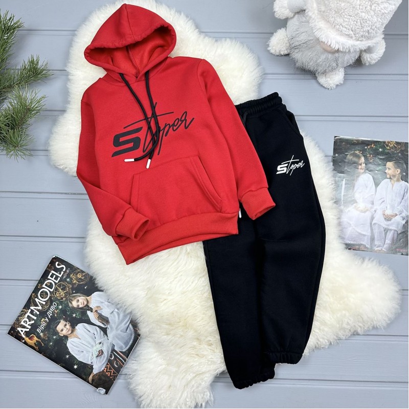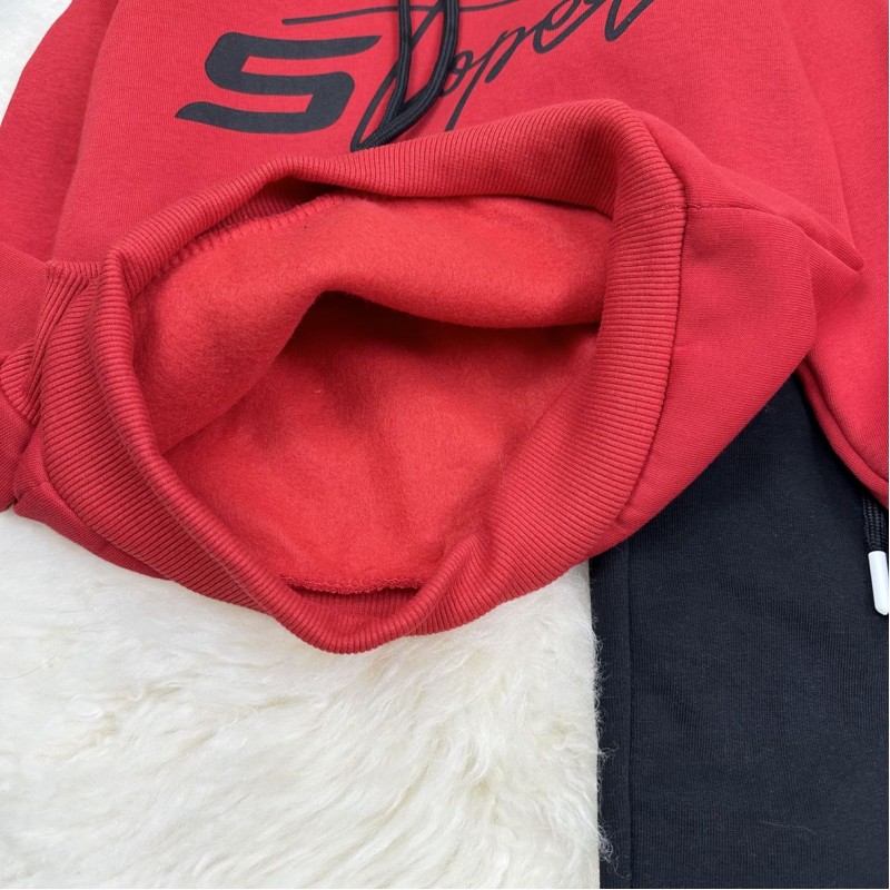 ✂️Костюм червоний тринитка на флісі. Не кошлатиться. Дуже гарний варіант на кожен день. Кофтинка з капюшоном та кишенею попереду. Штани з кишенями, є куліска. Напис - накат. Виробник Туреччина.