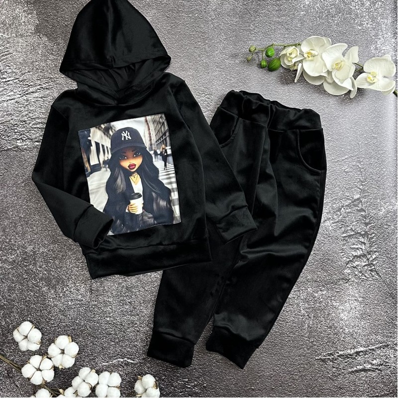 ✂️ Костюм велюровий чорний. Малюнок - нашивка. Штани з кишенями, в поясі резиночка . Тканина королівський велюр. Виробник Україна.